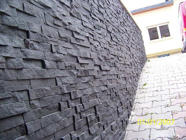 Kamień elewacyjny cementowy, barwiony w masie, o ciekawej łupkowej fakturze, produkowany z betonu o klasie wyt. ok. B20.